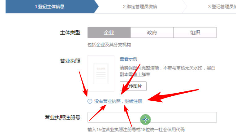 进入后点击(没有营业执照,继续注册)